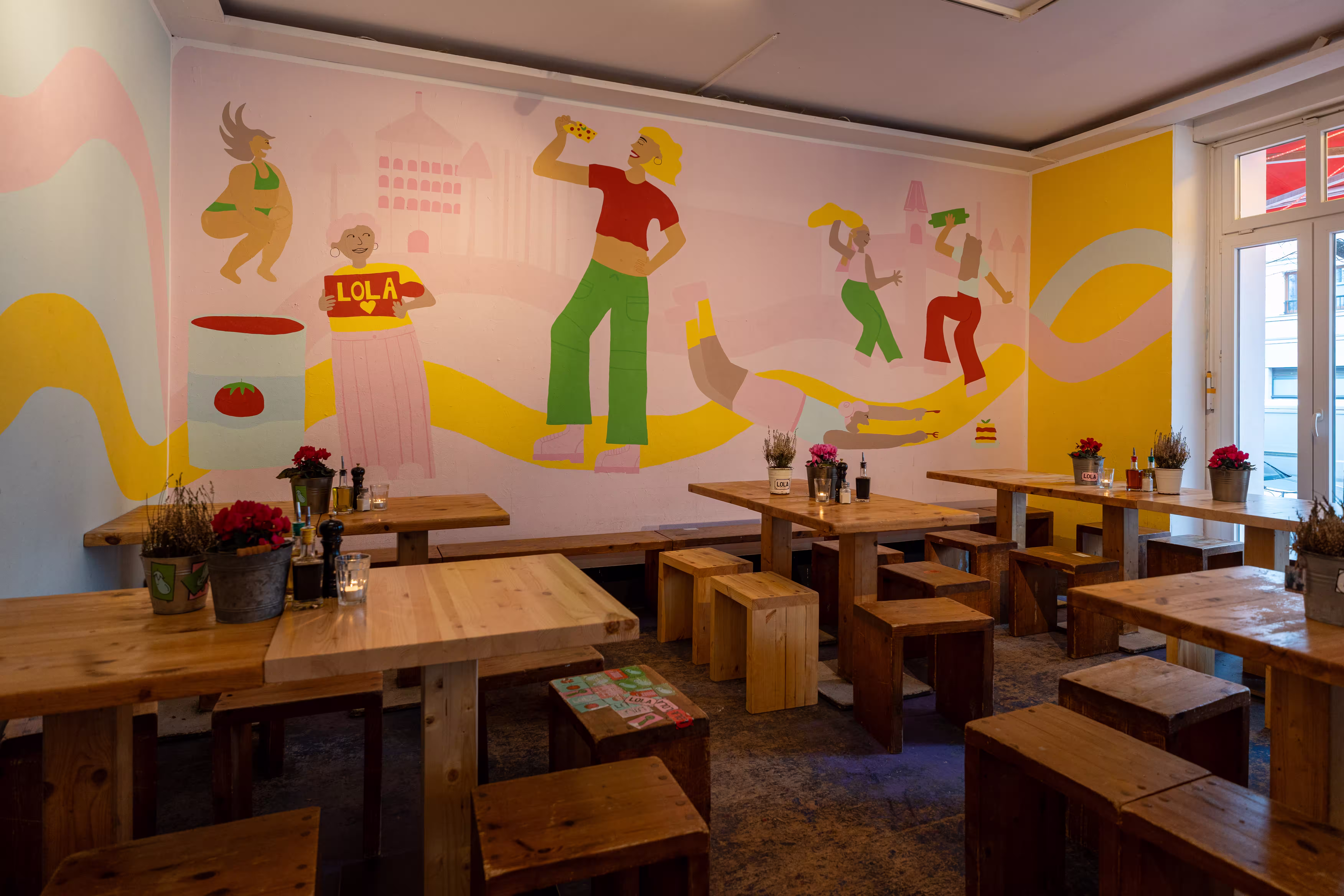 Brief: Lola Pizzaiola is a pizzeria in the hip chic neighborhood of Prenzlauer Berg, Berlin. They wanted a colorful and lively mural to welcome customers indoors during winter time.